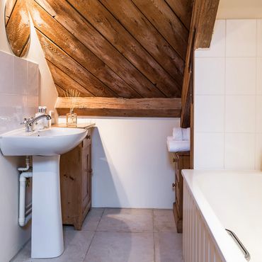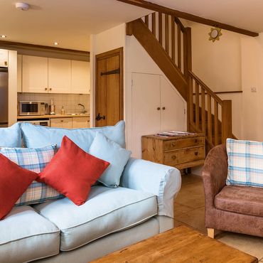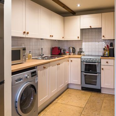The cottage has an open plan ground floor area. The well equipped kitchen has a cooker, microwave, a Meile dishwasher, an AEG washer dryer and an upright fridge /freezer.